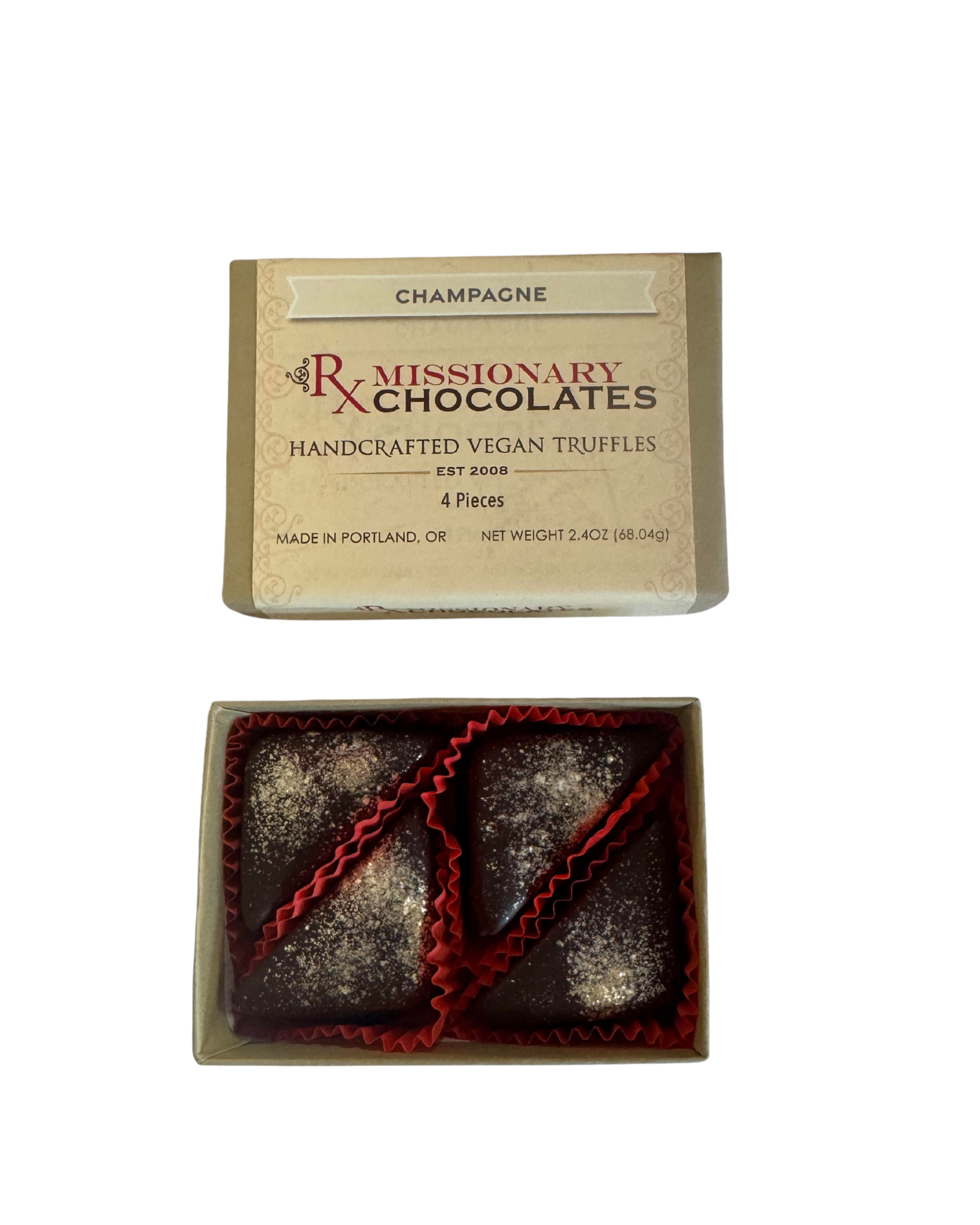 Ingredients: 64% Fair-trade chocolate (cacao beans, sugar, cocoa butter, sunflower lecithin, pure vanilla), Champagne.