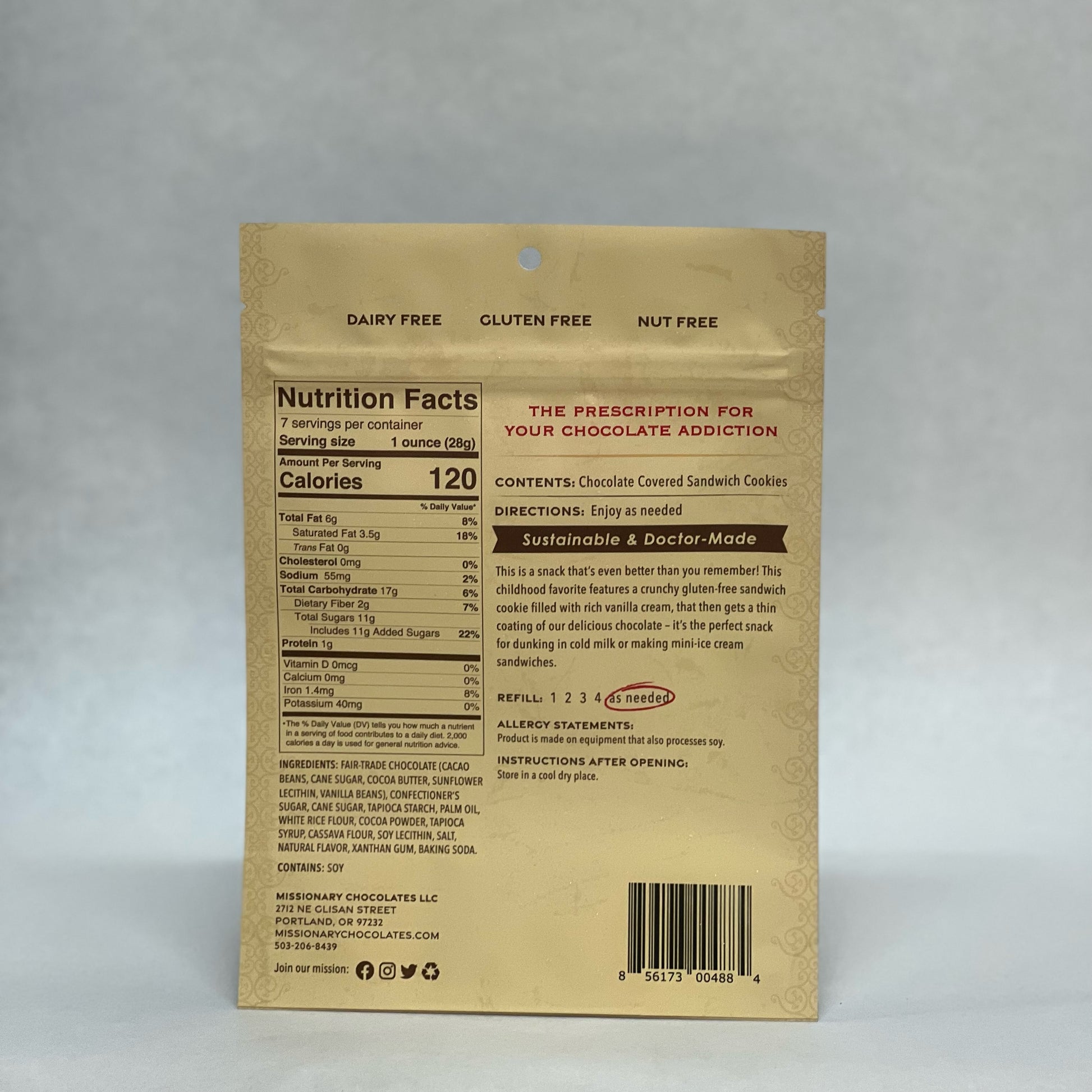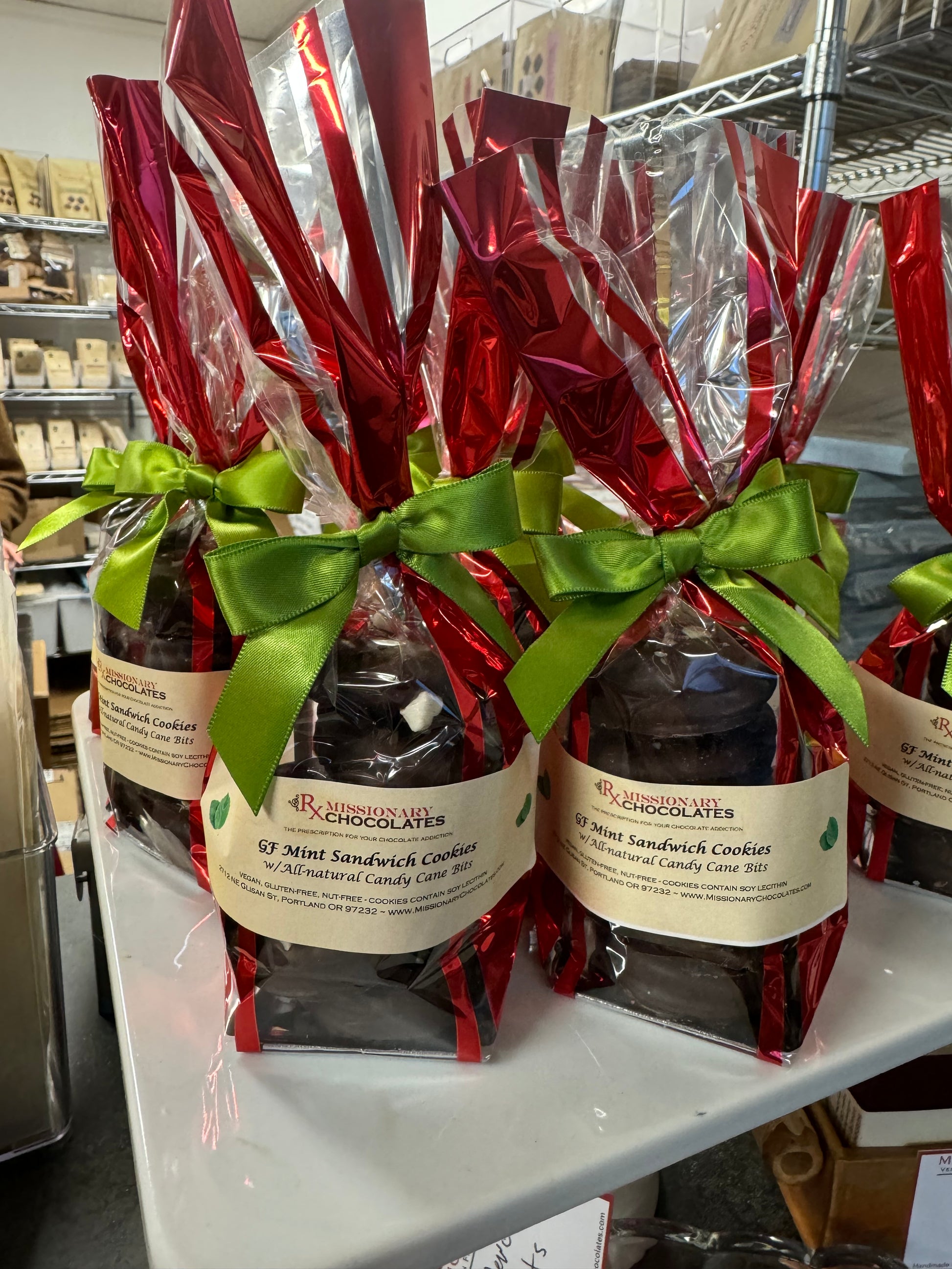 These visually stunning cookies are an incredibly delicious, brand-new find!! These MINT (colored with Spirulina) crème-filled gluten-free sandwich cookies are covered in our decadent 64% fair-trade dark chocolate, and sprinkled with all-natural candy cane bits. A perfect treat for Santa (and his many hungry helpers!) for 5 total cookies per bag.