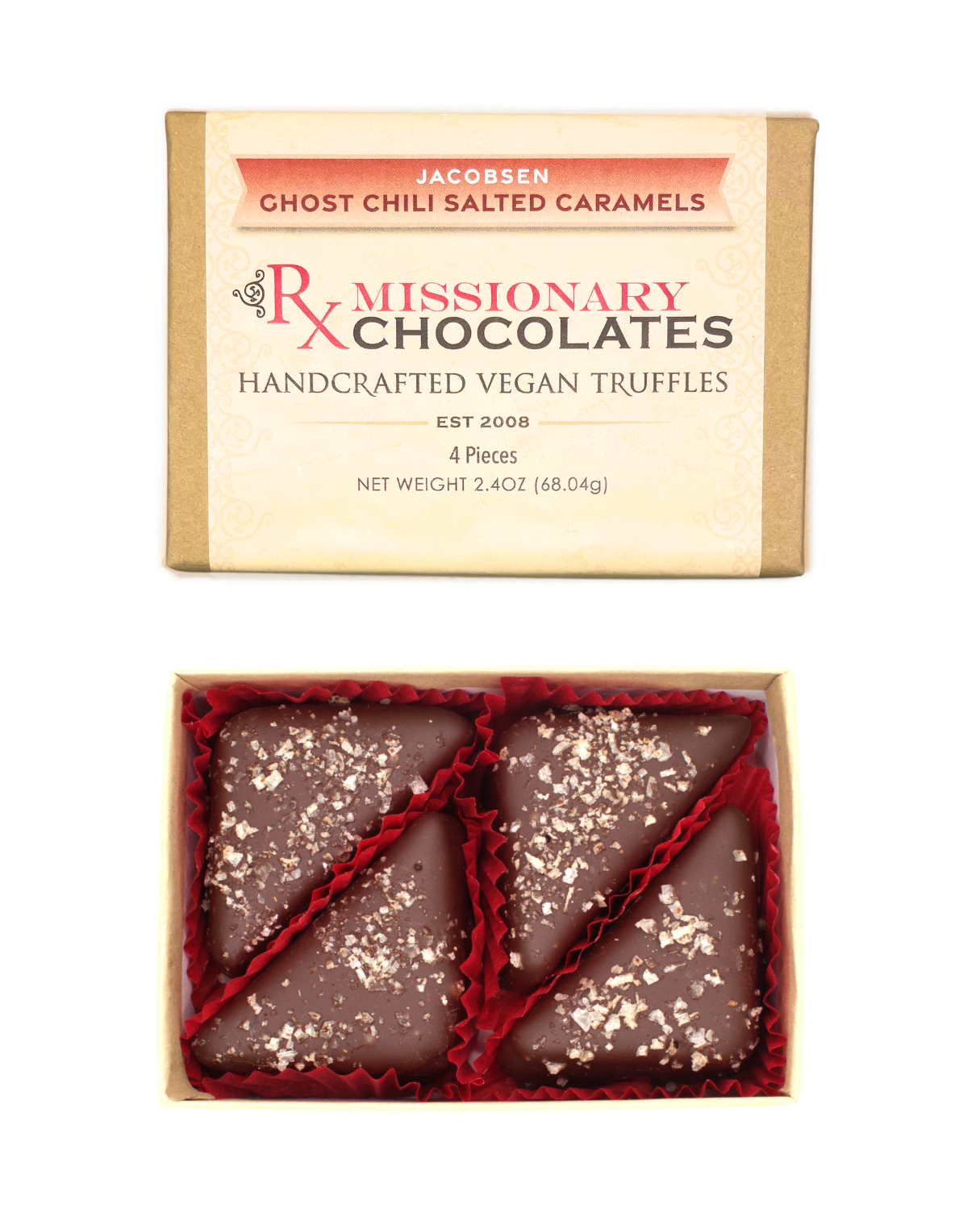 Ingredients: Fair-Trade chocolate (cacao beans, sugar, cocoa butter, sunflower lecithin, pure vanilla), organic coconut milk, organic brown sugar, organic vanilla, Ghost Chili salt. Gluten & Dairy Free!