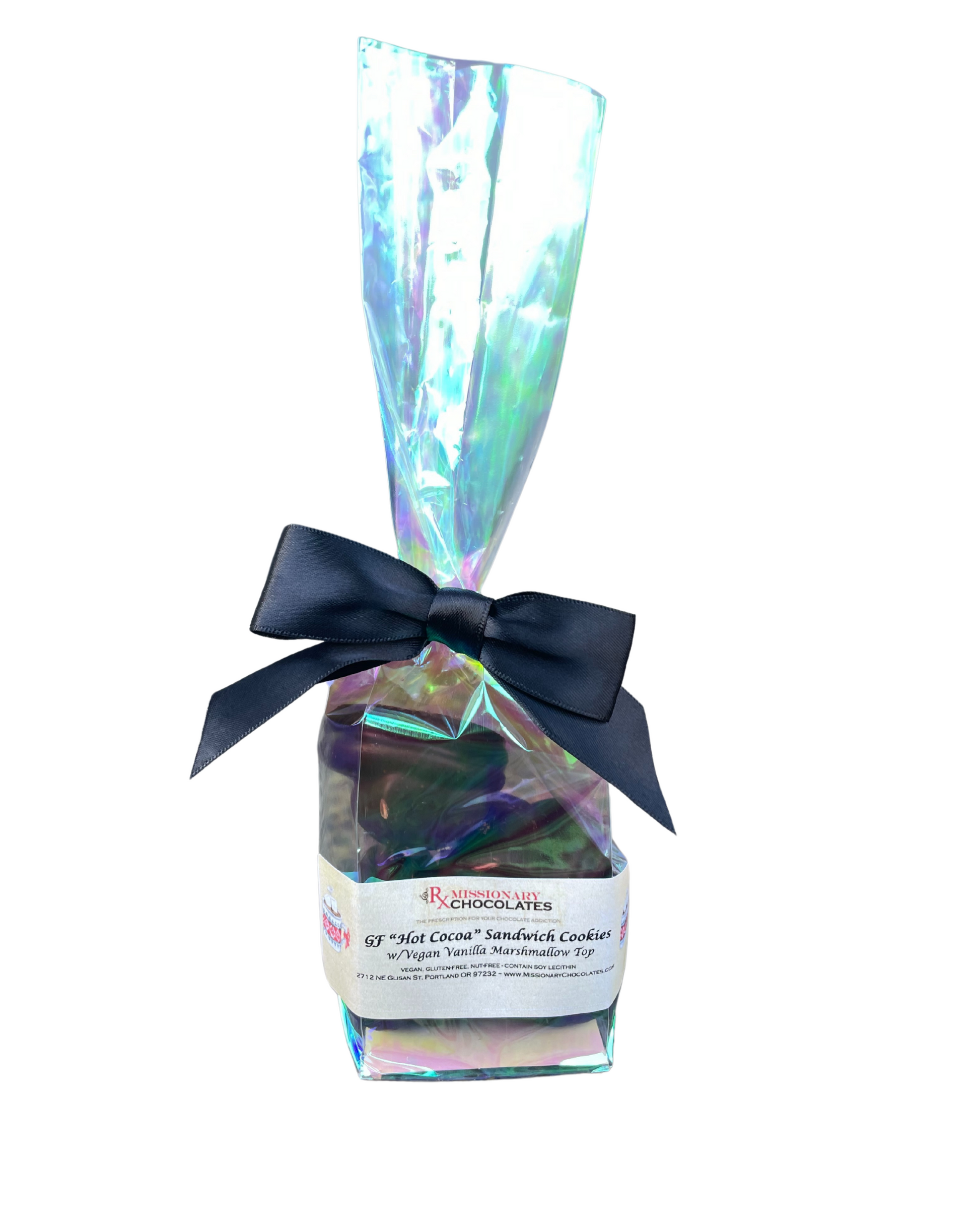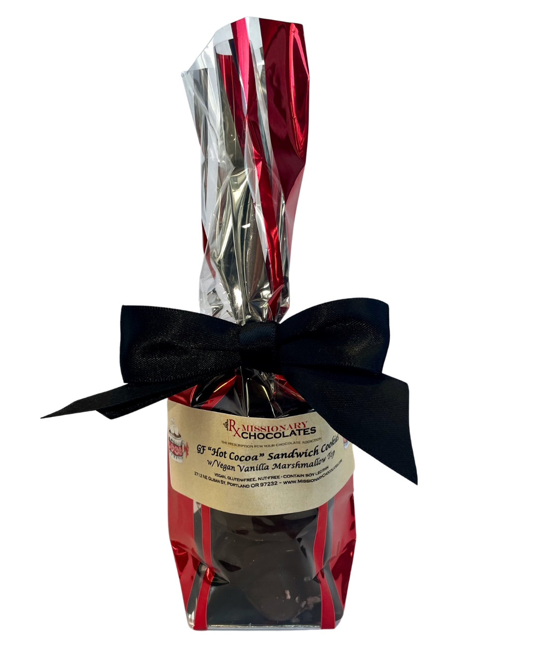 Ingredients: 64% chocolate (cacao beans, cane sugar, cocoa butter, sunflower lecithin, pure vanilla), GF cookies (sugar, palm oil, tapioca starch, powdered sugar (sugar, corn starch), corn starch, rice flour, inulin, cocoa (processed with alkali), tapioca syrup, less Than 2% of: cassava flour, cocoa powder, water, potato flour, soy lecithin, salt, xanthan gum, baking soda, natural flavor. CONTAINS: SOY.