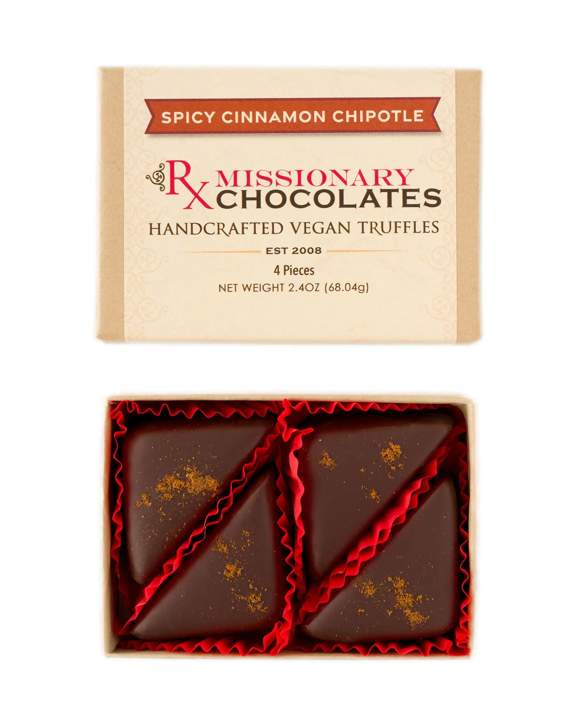 The very first spicy truffle ever made at Missionary Chocolates, it was inspired by our favorite Mexican restaurant in Sonoma CA! We blend organic cinnamon, chipolte, coconut milk and chocolate for a mole-reminiscent truffle that is perfect with a hot chocolate or a glass of dark red wine. Sweet, spicy and smokey!